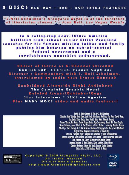 Alongside Night Blu-Ray Combo Pack Back Cover "J.Neil Schulman's Alongside Night is at the forefront of libertarian cinema."—Josh Bell, Las Vegas Weekly "Seeing the movie adapted into a full length movie was a dream come true." —Sean Gangol, The Libertarian Enterprise I believe Alongside Night will advance the cause of liberty." —Dr. Ron Paul, Ron Paul Channel, June 16, 2014 "The story is, by turns, touching, suspense-filled, violent when violence was called for, highly polemic, and altogether satisfying." L. Neil Smith, The Libertarian Enterprise " It's a handsomely produced film for its low budget. Well-acted and ingeniously directed." —John DeChancie, best-selling author "J Neil Schulman's film Alongside Night is just as brilliant as his original novel and it may be even more so with all of the anarcho-capitalist and libertarian visual Easter eggs placed in the background that are a treat and supreme delight for all of those in the know." —Justin Ptak, Facebook "A movie dedicated to promoting liberty and warning about a too powerful government."—Coos County Democrat "Abundant professional talent ...supported the making of this fine movie. The result is visually bright and stunning, laced and layered with great music and pregnant with the theme of the unquenchable human spirit seeking liberty." —Jerry Jewett, Mondo Cult Alongside Night has been recognized as an important projection of near-future crises on such diverse mass media as Fox News' Red Eye, ABC's On The Red Carpet, The Ron Paul Channel, Alex Jones' Infowars, Reason.TV, the Larry Elder Show, Las Vegas Weekly, the Libertarian Republic, the Sam Sorbo Show, and many blogs, local TV and radio shows, and podcasts. With recommendations from Ron Paul and Alex Jones to their millions of listeners and viewers this movie has a fan base eagerly awaiting it. Official Movie Website: http://www.AlongsideNightMovie.com Official Facebook: http://Facebook.com/AlongsideNightMovie Official Twitter: http://Twitter.com/AlongsideNight YouTube Alongside Night Short Video Play List: https://www.youtube.com/playlist?list=PL-Amt4eMOq4MupHcidoJdPZ2ajFjpIVMv
