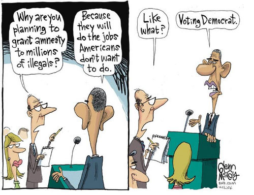 Illegal Immigrants, Criminality, and Consequences Both Intended and Unintended Writes Paul Bonneau: "I was a bit unsure how to take Rich's letter: 'The illegal immigrant KNOWS that he's committing a crime just by BEING on U.S. soil.... he knows that he's a CRIMINAL.' "I would have been more impressed had he put the words 'crime' and 'criminal' and 'illegal' in quotes, since he was talking about mala prohibita after all. "Though no doubt the group 'illegal' people includes its share of scoundrels, like any population, still I admire the fact that the first thing these folks do upon entering the US is to break a bullshit law. If only 'real' Americans were similarly unimpressed by petty diktats. Living in the underground economy is something to be admired, not nit-picked (if that is what Rich is doing - it was not clear to me). "As to crime syndicates, they are almost always creations of government, if sometimes unintended." ---------------------- Mr. Bonneau misses the key point made toward the close of my letter, to the effect that the illegal immigrant (or would it be better to call him 'the trespasser'? fuck it; like the term 'anchor baby,' it's the expression in use) is—by virtue of arguably 'bullshit law' -- without the practical benefit of many protections accorded de facto and de jure by the rule of law in American society. This speaks not so much to the criminal mens rea of the illegal immigrant but rather to the peculiar vulnerabilities he suffers by being intrinsically and unavoidably subject to criminal sanctions (however capriciously enforced). In his eagerness to praise 'Living in the underground economy,' Mr. Bonneau fails to appreciate the degree to which such na levo status renders the illegal immigrant susceptible to exploitation not only by the informal but pervasive criminal sector of American society but also by demagogues like Stanley Ann Dunham's incomplete abortion, our own Illegal-Immigrant- in-Chief, whatever alias the arrogant bastard's using at the moment. The existence of America's present and anticipated illegal immigrant population is to be deplored not simply because they've broken some 'bullshit law' but because they present the criminal classes in our society (governmental and non-governmental) with a category of resources which can be—and ARE being—exploited to the detriment of individual human rights both within and without that population. An interesting political cartoon recently made the point that these illegal immigrants really ARE needed to handle jobs that Americans won't do.