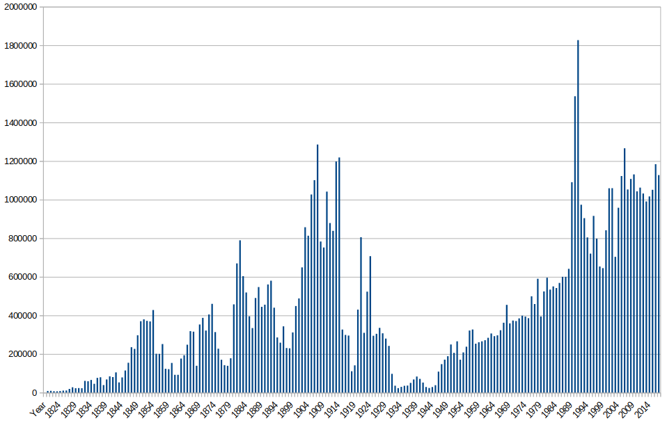 This is a very different picture. There are clearly two different epochs. In the first, between 1820 and 1930, the U.S. was “filling up the empty country” by admitting large numbers of immigrants. Then, due to immigration restrictions in the Immigration Act of 1924 and the subsequent economic depression and war, immigration remained at low levels until 1946 when, in the immediate postwar period, it jumped. In this view, the impact of the Immigration and Nationality Act of 1965 was not the discontinuous change some present it as (at least in terms of absolute numbers; it may have changed the composition of the immigrant population, which is not captured in these statistics).