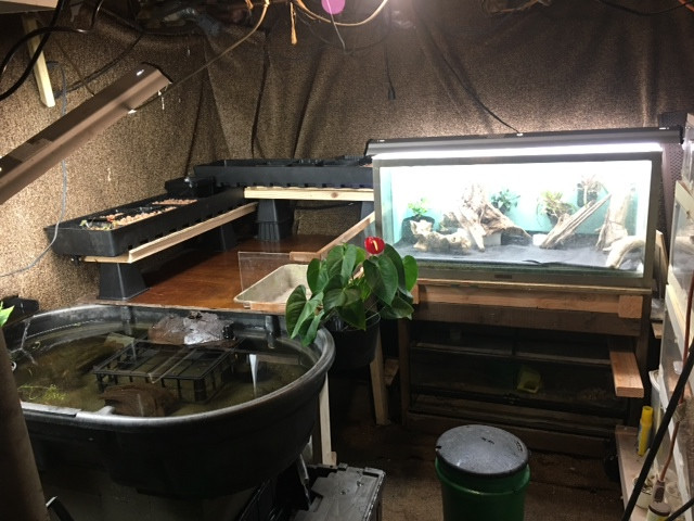 I've been very busy at it this winter going into spring ; which is why I haven't been as prolific at writing lately. I have made lots of progress since I last reported solving the problem of supporting the hydroponic trays with plastic bed risers, getting the basic skeleton of a shallow water platform in place and the vivarium build using Chuck's old metal frame tank which I decided to go with instead of the 40 B that previously occupied the stand beside the Turtle Table.
