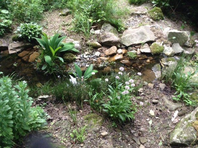 But at the expense of so many other things. Such as work outdoors that has apart from general upkeep of the place and care of the animals did not progressed as much as I originally hoped for. Going back to late May just before second vacation week I did take the time to clear away the superfluous plant growth around the middle pool and falls of the watercourse and exposed the beautiful stonework of the original design that was smothered by mats of stream sedge and dwarf horsetail over the years.