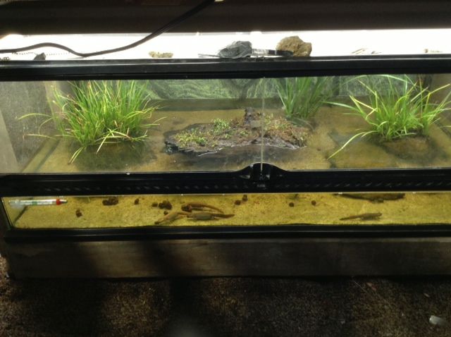 I fed the newts that afternoon. Their setup is also coming along nicely with dwarf sweetflags rooting firmly on the rocks I zip tied them onto and the ramshorn snails are doing a good job cleaning up the surplus food and algae.