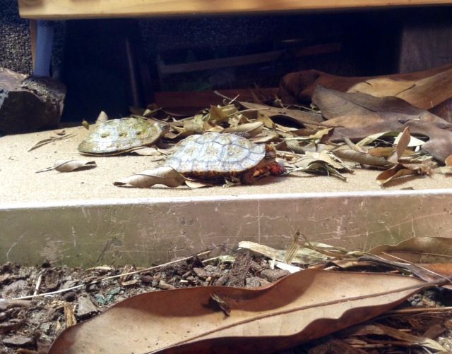 The two hatchling Rhinoclemmys areolata—Mexican furrowed or “Belize Wood Turtles” as they were more commonly called back in the day when I had them before—arrived this morning. While not quite as pretty as the Psquares they certainly are as cute as all get out at this size and are an interesting and personable species to work with from that genus.