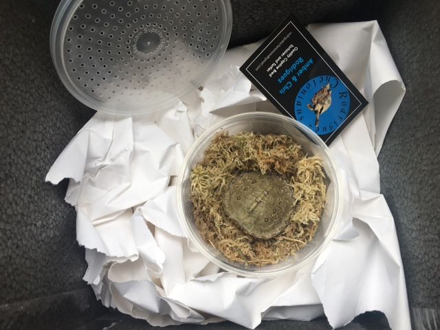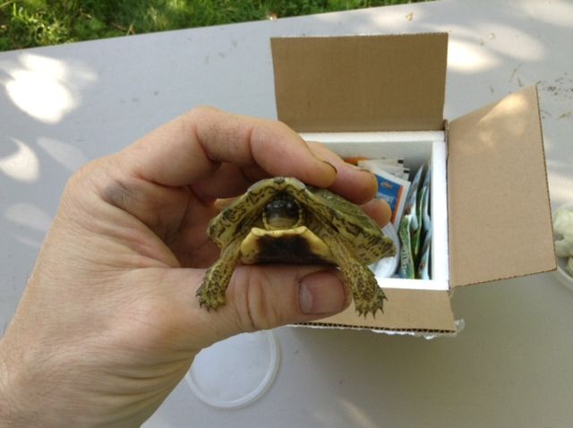 Hatchling “male” Rhinoclemmys pulcherrima pulcherrima aka Guerrero Wood Turtle or “Psquare”; a nickname dubbed in reference to its repeating Latin binomial—arrived alive and well this morning after an overnight trip from California by Fed Ex.