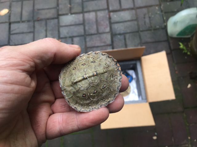 Astonishingly big for a new hatchling only a couple weeks old but that is typical of this genus which lay a few large eggs at separate intervals during the nesting season rather than a single clutch of more numerous but smaller eggs like native wood and Box Turtles do. This guy is even bigger than a Gulf Coast hatchling which is the biggest of the North American Box Turtles.