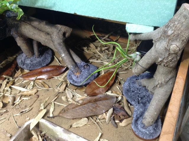 This is a later photo where I added air plants on small cork bark mounts with pegs of heavy gauge floral wire that insert into the branch on the wall. I've also started on the facades for the trays using insulation board covered with spray foam like the vivarium background.