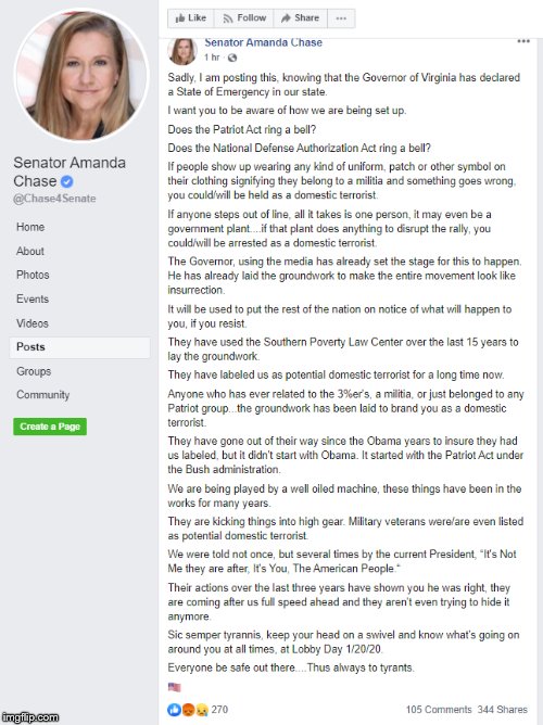 In case it disappears, it is from Virginia state senator Amanda Chase, who warns that Monday’s Second Amendment rally in Richmond and that hotheads—or agents provocateur—could get 2nd Amendment advocates labeled ass domestic terrorists in insurrection.