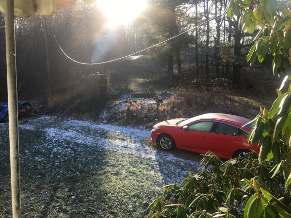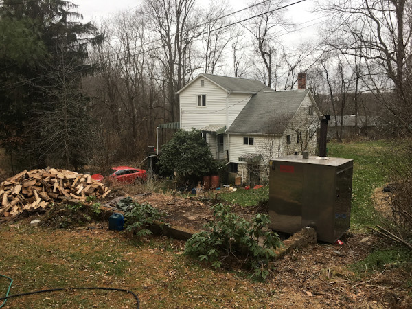 The fire had gone out and two big chunks I threw in last night and part of a smaller log from yesterday afternoon remained. There were also some live coals that a managed to rekindle from with a dead pine branch and twigs broken up and some old motor oil poured on the logs for good measure. Hoping the split wood I have coming tomorrow will mitigate this problem with the bigger logs not catching or sustaining a burn. It’s looking more and more—excuse my redundant repetitions—like I’ll be using both systems in tandem running on oil when I’m away for the day and switching over to the outside system for the night which conserves oil plus it’s no biggie to switch back in the morning to catch up and reload the fire box. The one thing I’d rather avoid is having to relight the fire from scratch and have to wait forever for it to heat up the boiler and in turn the house. The nice thing about good old reliable oil is that it catches up quicker and keeps up better in colder weather.