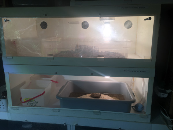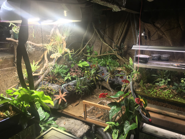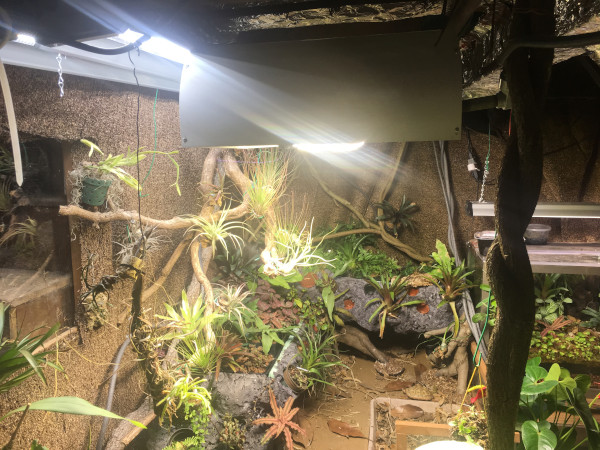Soaked the air plants for a couple hours and spread them out in a potting tray to dry while I was gone and put them back on the branch when I got home. Also the picky areolata ate her 6 pellets while in the feeding bucket. The new setup in the snake cage seems to be working out well. The enclosed space and 60 watt bulbs give the little ones extra warmth and more waste heat for the Room.
