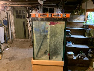About an hour prior I tinkered with some 2x12 turtle pen center braces on hand to use as skids to slide the tank down the steps if it proved too difficult to carry it through the doorway. That proved unnecessary. The crew was able to carry both stand and tank in very easily and set it into place. It also levels almost perfectly despite my worst fears.