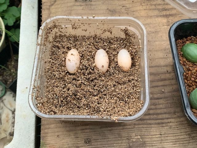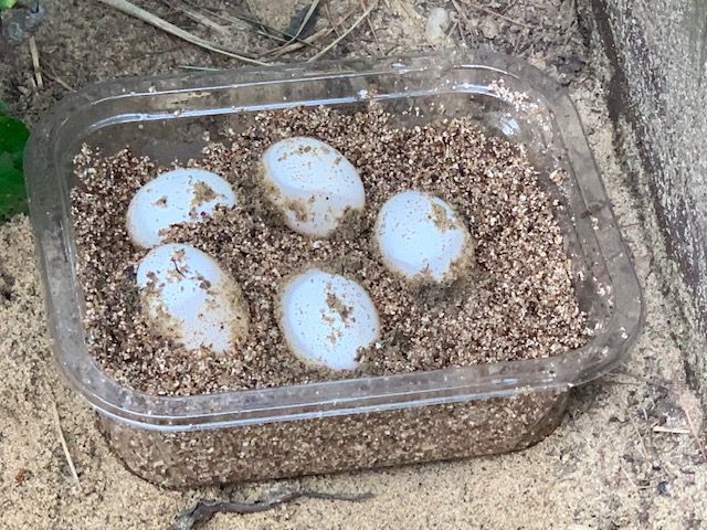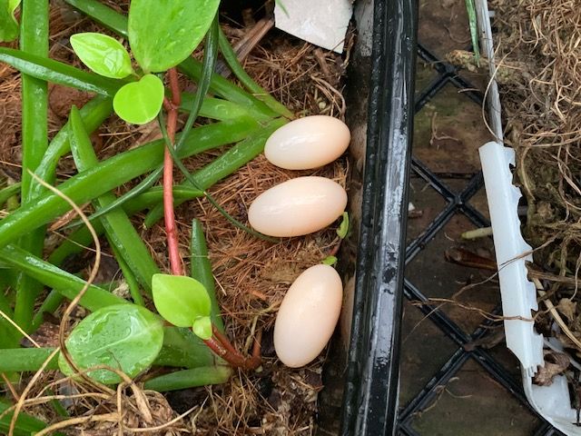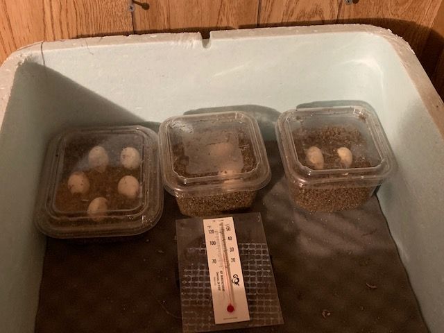 Totally unexpected but you know turtles. The females can store viable sperm to fertilize eggs for several years after coupling. It’s been more than 5 years for this one which is probably pushing the envelope and the eggs were dropped in the water—but they were still intact so they had not been there long or else they would likely be broken and partially eaten. Worth rescuing so I recovered them and laid them in a community flat of orchid seedlings for safe keeping while I prepared a container with vermiculite to incubate them in.