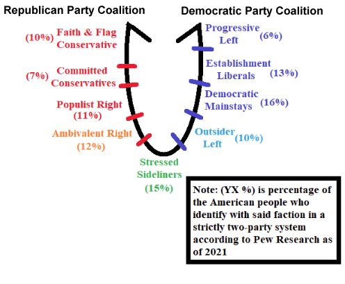 (It is Pew Research’s belief that both the Democrat and Republican parties are coalitions composed of four broad factions. The four factions of that composed either the Democrat or the Republican parties actually have very little they agree upon unanimously. Pew Research argued in their report that a horseshoe image would accurately demonstrate the 9 political factions they believe exist in America today, yet did not provide such an image in their report. The image below is one I made based upon their conclusions.)