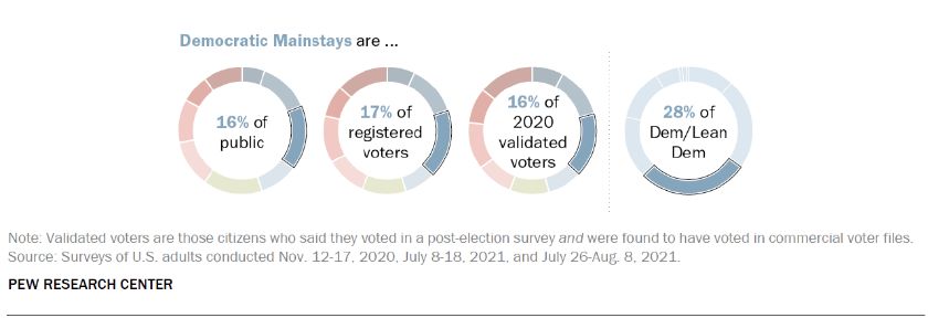 "Democratic Mainstays are among the most diverse groups in terms of race and ethnicity. Fewer than half (46%) are White, 26% are Black, 20% are Hispanic and 4% are Asian.