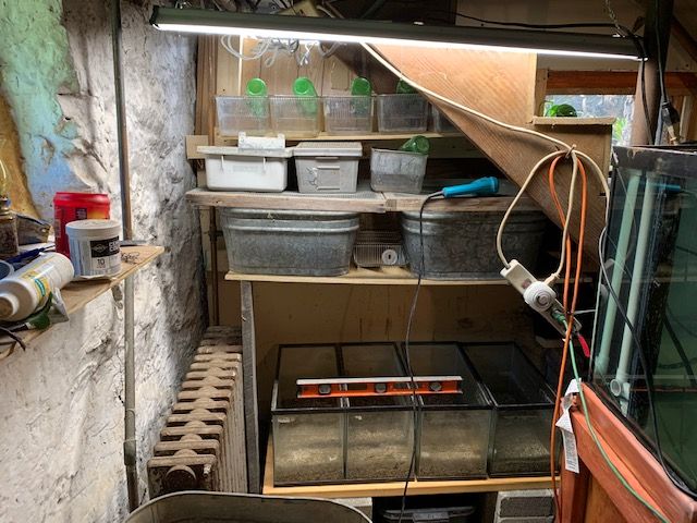 Other project of the week was the reboot of the mouse colony that I had going briefly back in my first year out of the service. Before I mothballed the cages and equipment for years. Jerry rigged some shelving in the space under the staircase where I had the mice set up before I gave up on them in favor of buying bulk frozen ones in bags and the space was devoted to a set of ten gallon aquariums that became my holding tanks for new fish and for rearing young ones from my own.